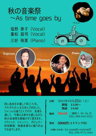 10/25(土) 「秋の音楽祭」 塩野泰子(vo) 重松昌司(vo) 三好萌夏(pf)