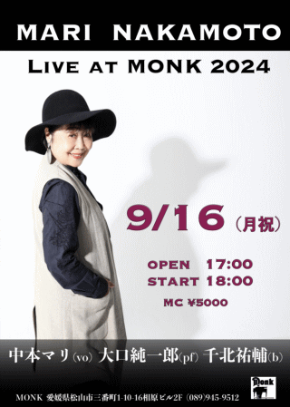 9/16(月祝) 中本マリ(vo) 大口純一路(pf) 千北祐輔(b)
