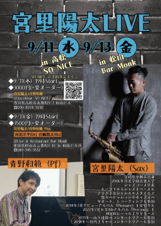 9/13(金) 宮里陽太(sax) 青野和範(pf) 岩﨑悠太(b) 河北洋平(ds)