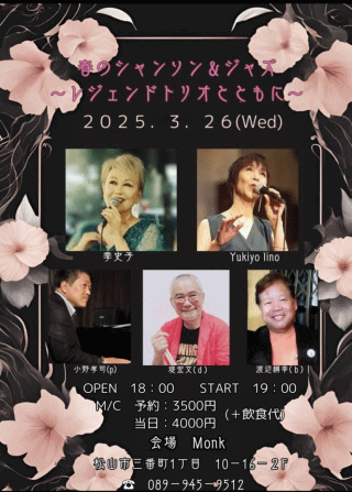 3/26(水) 小野孝司(pf) 渡辺綱幸(b) 堤 宏文(ds) 季史子(vo) Yukiyo lino(vo)